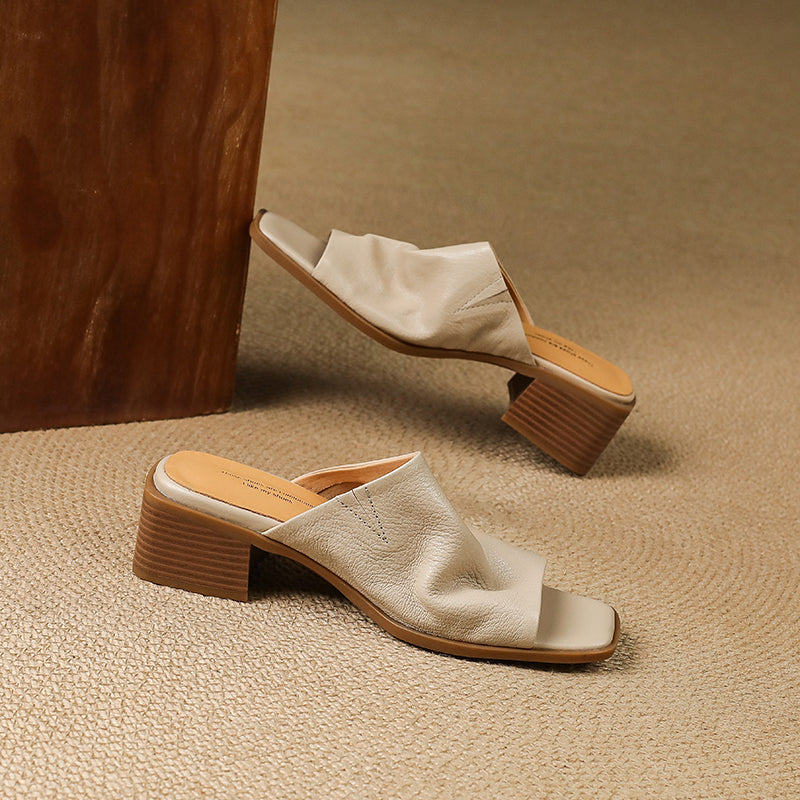 Women's Leather Ruched Square Toe Mules Minimalist Wedge Sandals