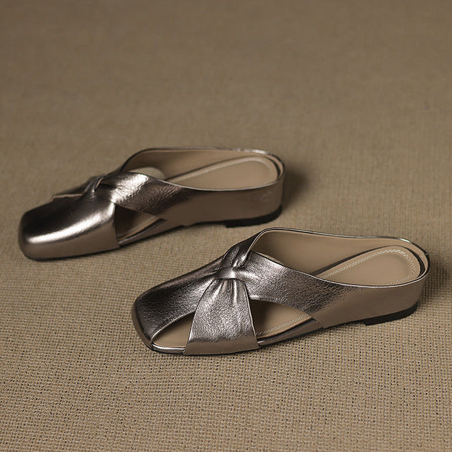 Women's Minimalist Leather Mules Elegant Cut-out Slip-on Shoes with Metal Accent - Round Toe