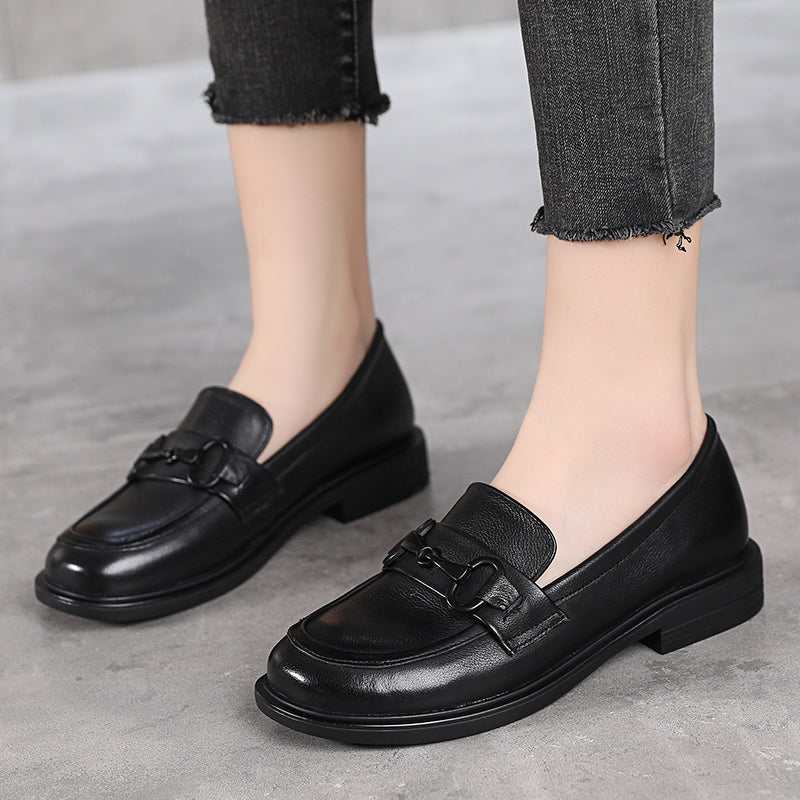 Women's Leather Vintage Metal Buckle Square Heel Loafers