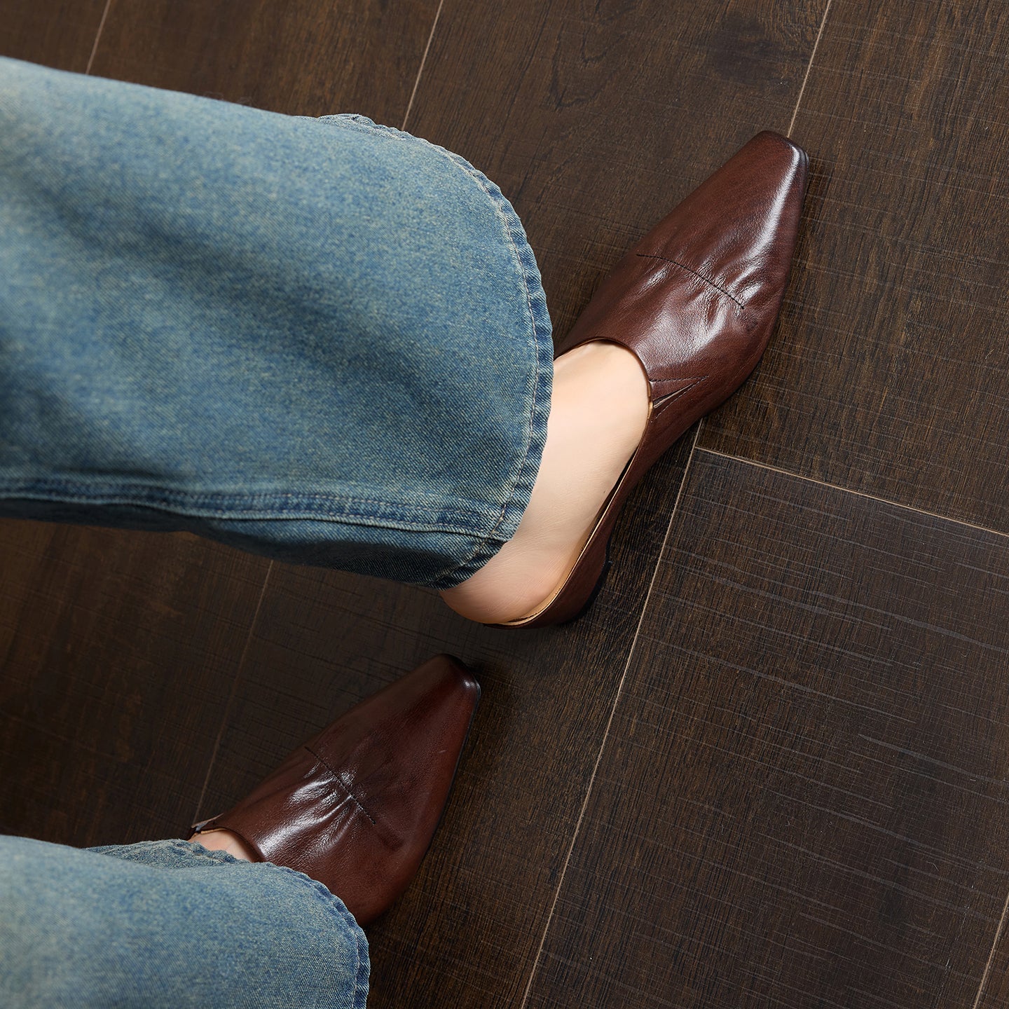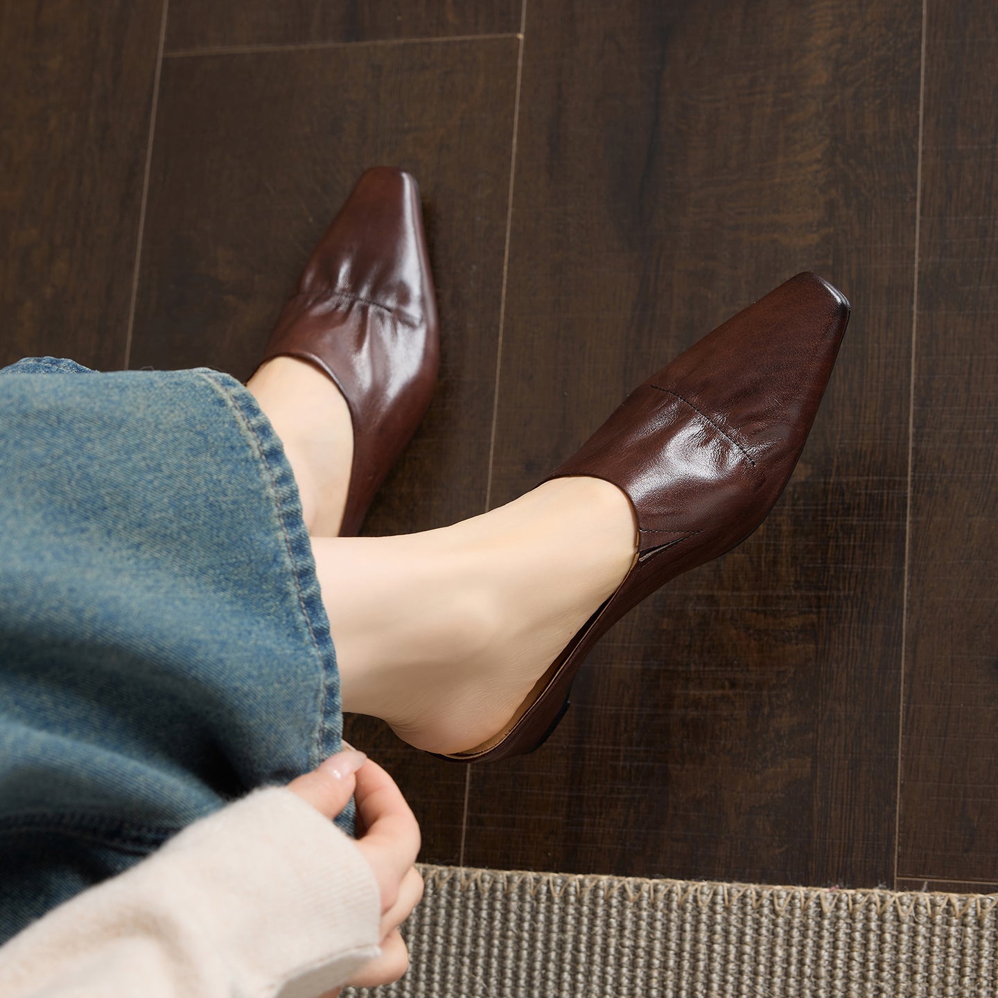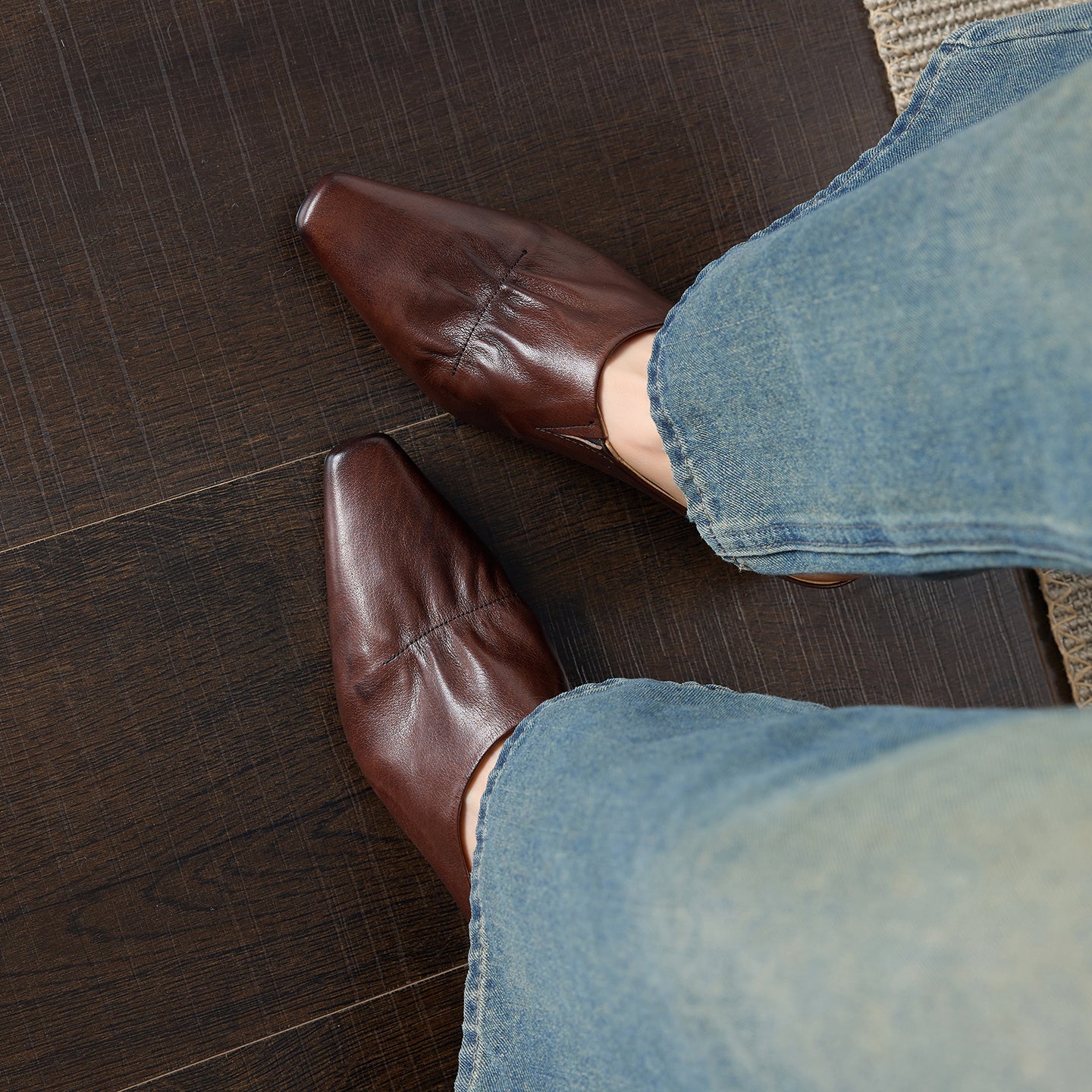 Women's Leather Ruched Square Toe Mules Minimalist Wedge Sandals