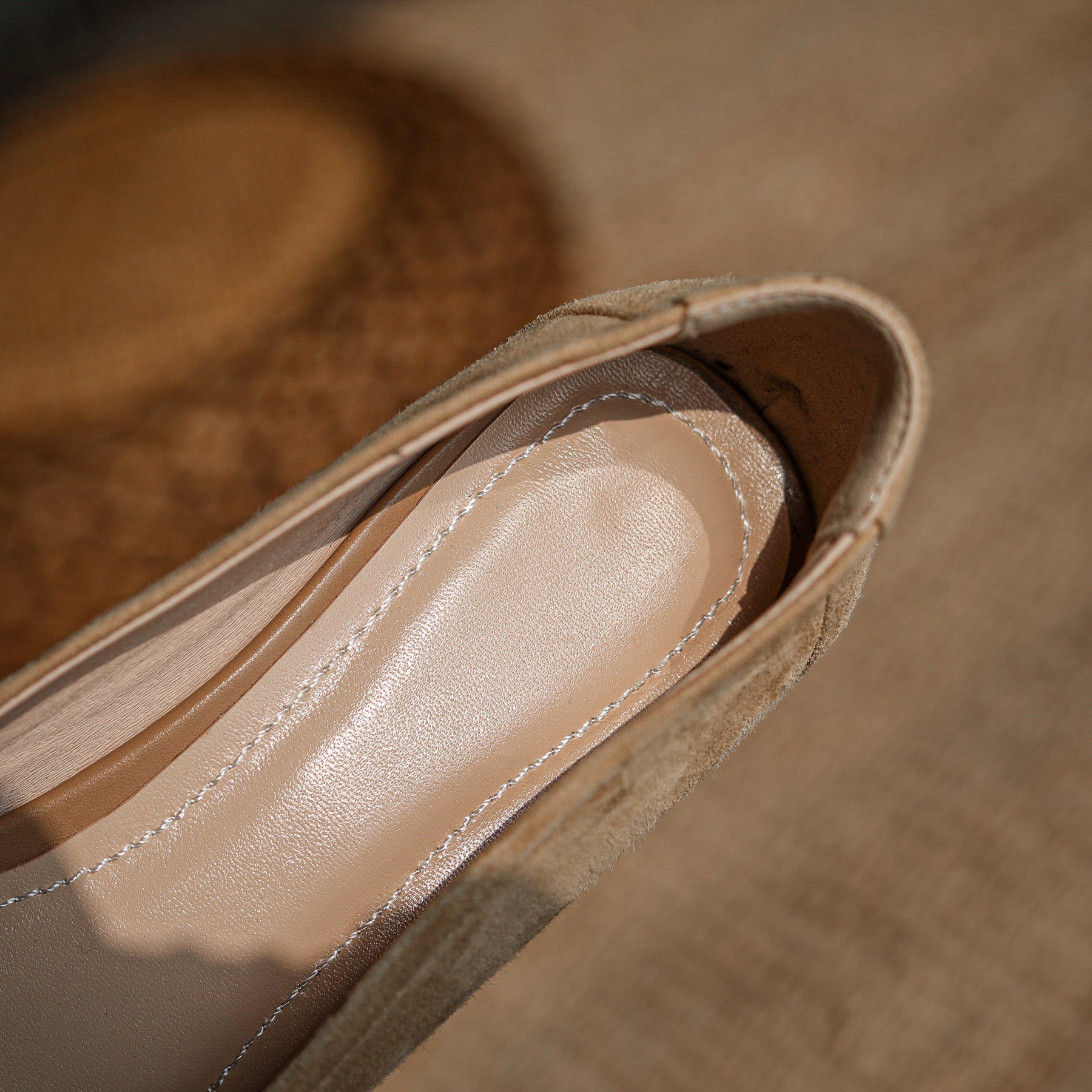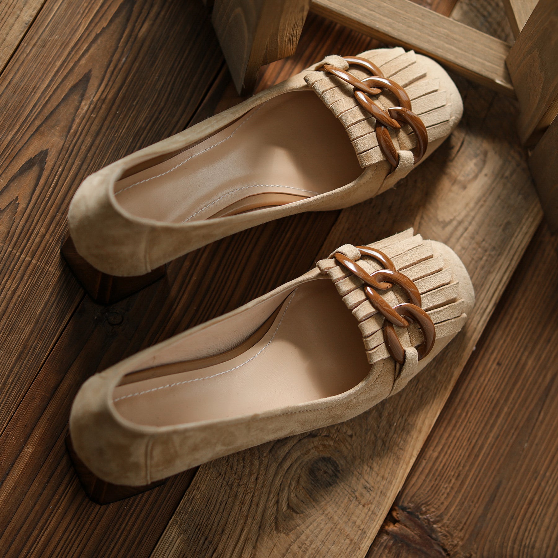 Elegant Women's Suede Leather Pumps – Mid Block Heel with Tassel & Chain