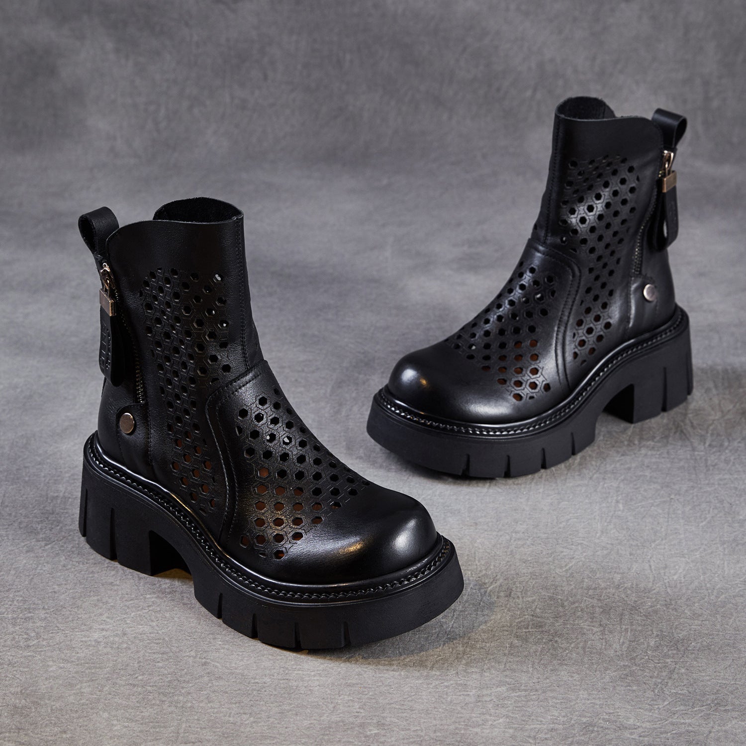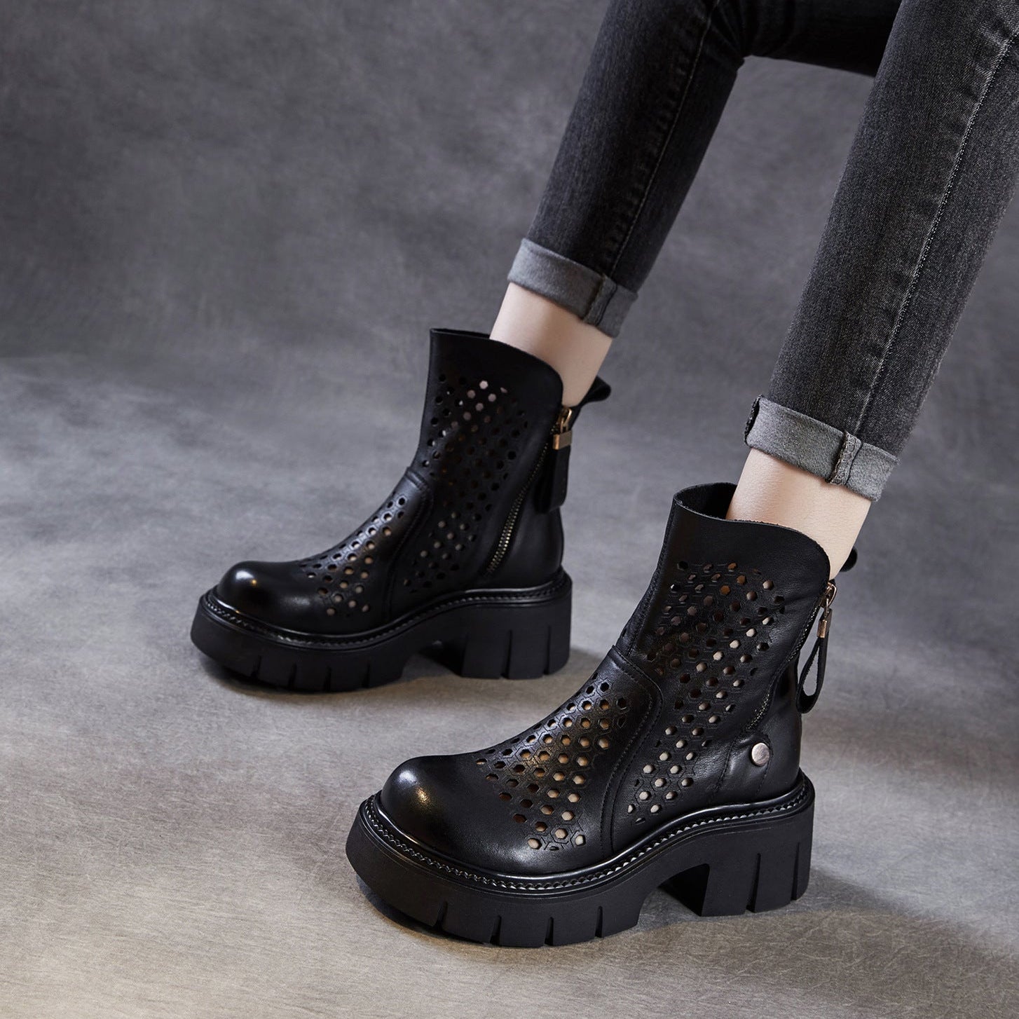 Women’s Retro Leather Cut-Out Ankle Boots – Summer Chunky Block Heel Zip Boots