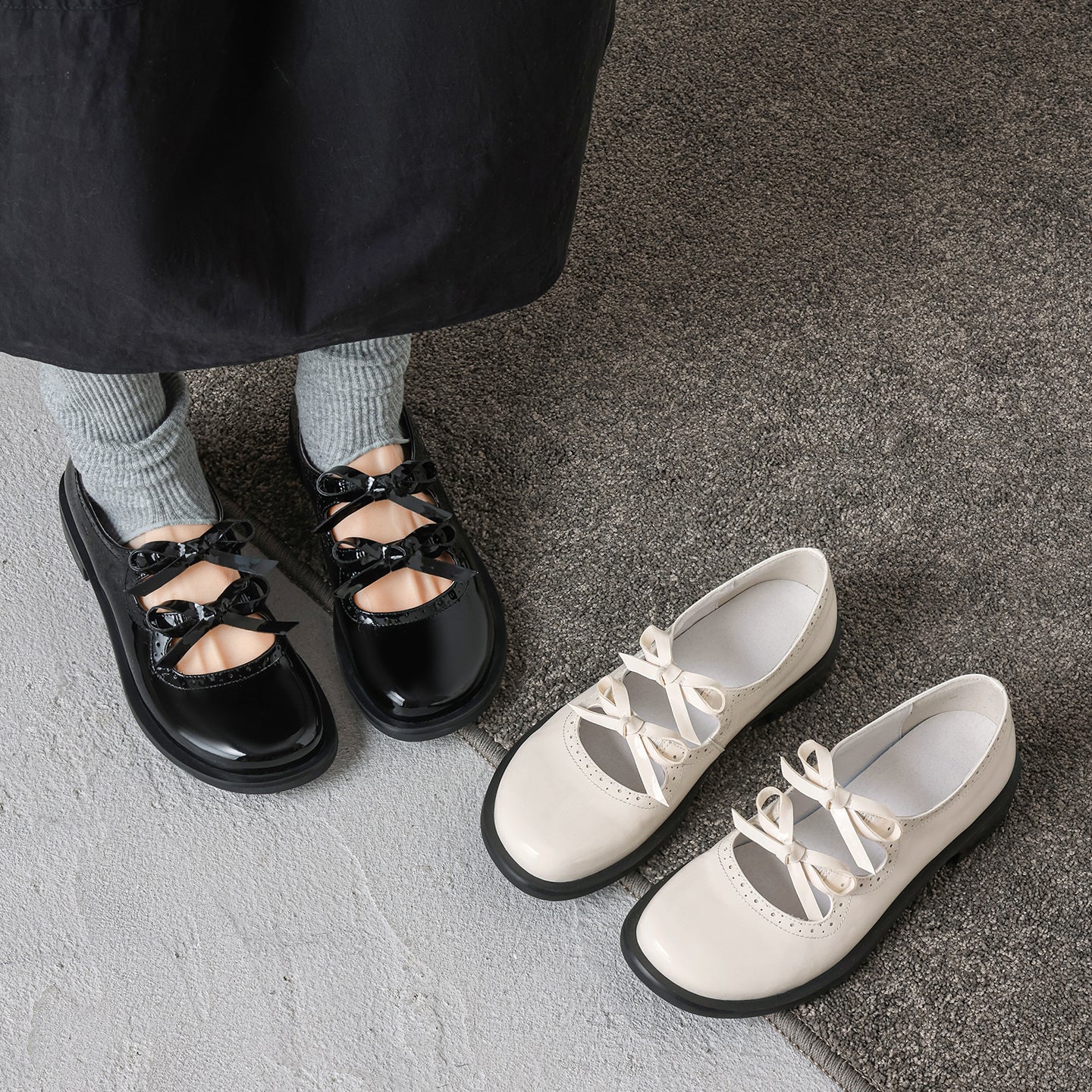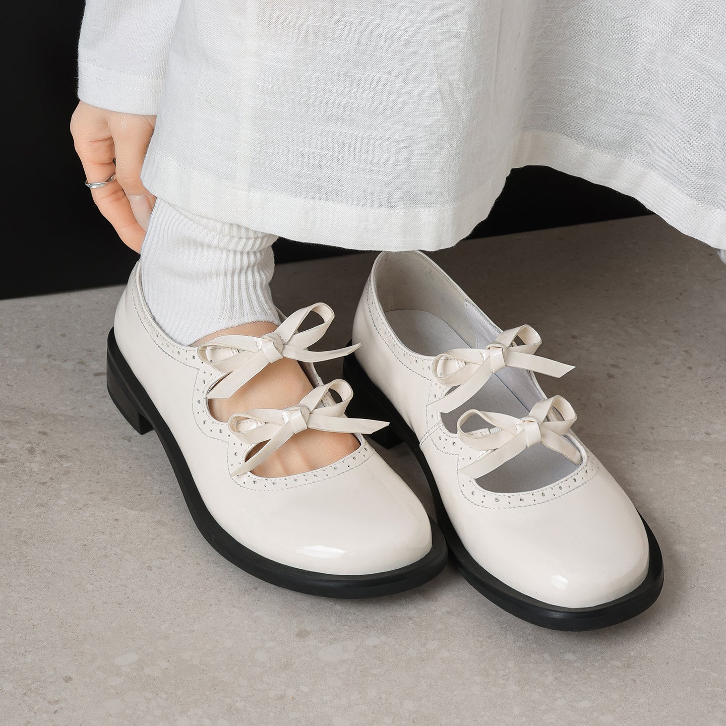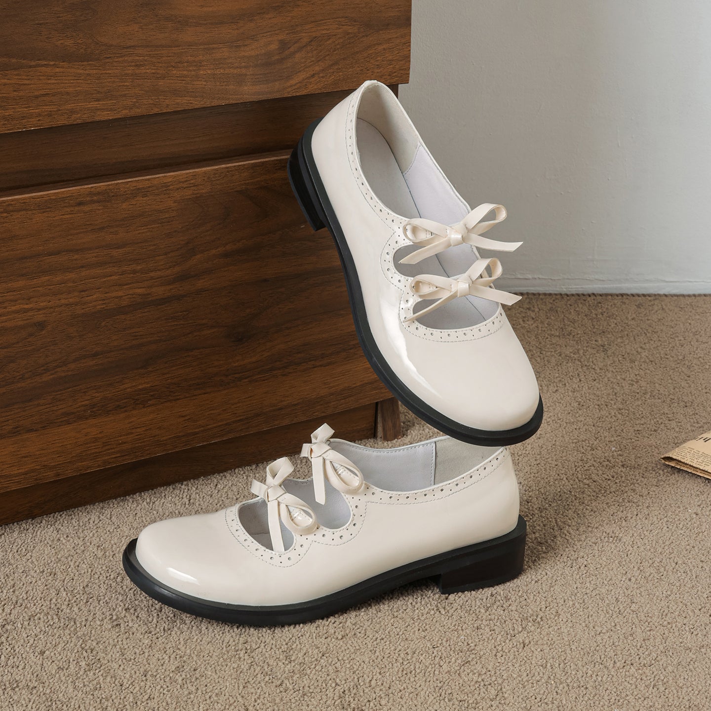 Step into a world of charm with these first-layer cowhide Mary Janes. Featuring a delightful double-bow design and intricate scalloped cut-out detailing, these flats perfectly embody French vintage sweetness. The interior is crafted for all-day freshness, featuring a breathable pigskin lining and a soft pigskin insole ideal for Spring and Summer. Set on a practical 1.0cm flat heel with a non-slip rubber outsole, these Black or Beige leather shoes offer the perfect mix of whimsical style and grounded comfort for everyday elegance.