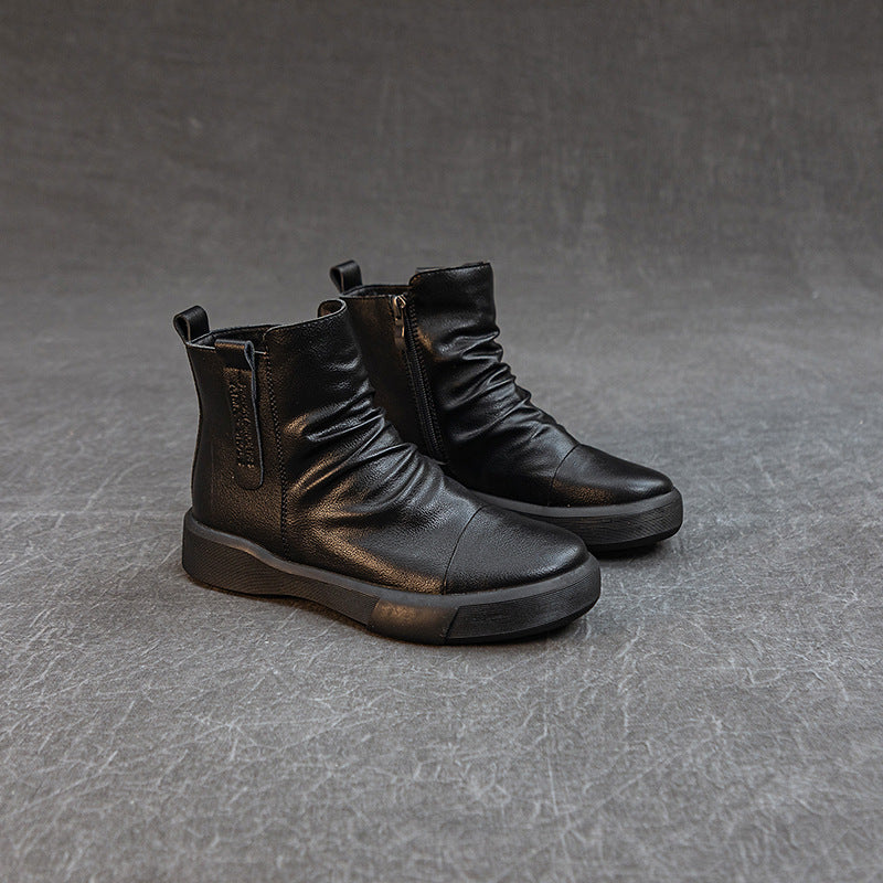 Comfortable Women's Flat Leather Boots – Casual Ruched Ankle Style