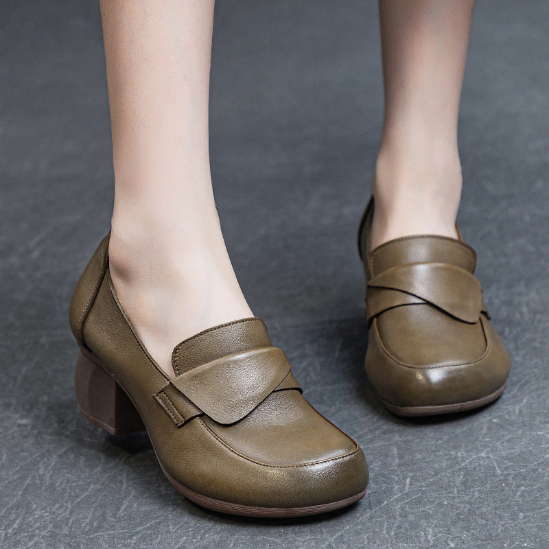 Women's Thick Medium Heel Soft Sole Head Layer Cowhide Retro Style Loafers