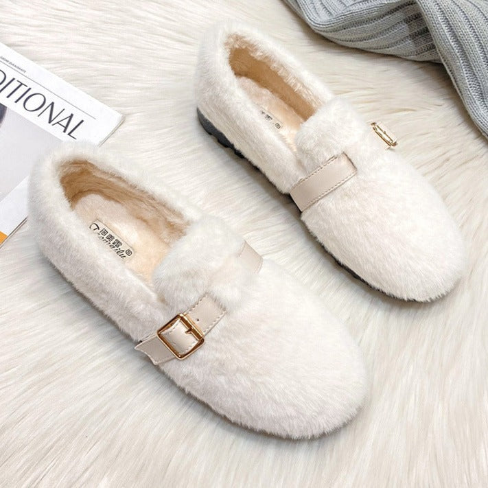 Women's Warm & Comfortable Plush Fur Loafers Shoes, Round Toe, Versatile, Flat Heel, Soft Bottom, Driving Shoes, Winter